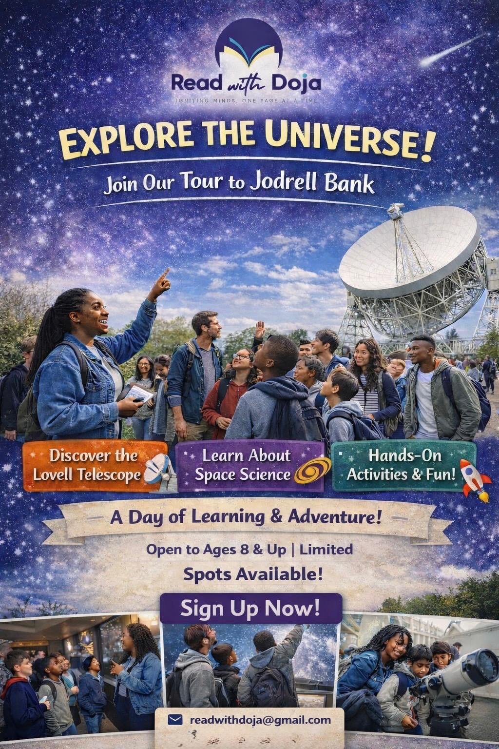 Join Our Tour to Jodrell Bank- Discover the Lovell Telescope- Learn About Space Science- Hands-On Activities & Fun!A Day of Learning & Adventure!Open to Ages 8 & Up | Limited Spots Available!Sign Up Now!readwithdoja@gmail.com